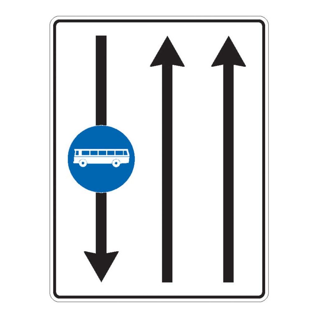 Banda de circulatie rezervata autovehiculelor de transport public de persoane F28, indicator de orientare.
