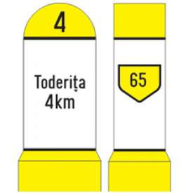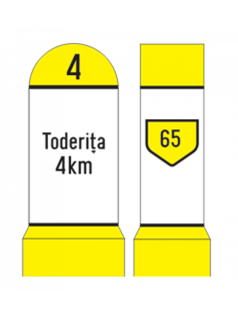 Borna kilometrica plastic drum comunal-folie refl CL I Borna kilometrica plastic drum comunal-folie refl CL I executat din material plastic colorat în masă materialului în galben. Pe suportul de plastic se aplică folie reflectorizantă, produsă de 3M-SUA, inscripționată conform cererii beneficiarului. Culoarea indicatorului kilometric și clasă de folie reflectorizantă utilizată diferă în funcție de categoria drumului. Pentru drumurile comunale (DC) se utilizează folie reflectorizantă clasă 1. Folia reflectorizantă este aplicată pe trei fețe ale indicatorului kilometric (vizibil pentru conducătorii auto din ambele sensuri de circulație și perpendicular pe axul drumului). Sistemul de prindere al indicatoarelor permite fixarea acestora în beton. Sistemul de fixare al indicatorului kilometric este executat din țeava de oțel cu diametrul de 76mm. Sistemele de fixare sunt solidare cu bornele, permițând plantarea acestora direct în beton. Pentru a se evită rotirea indicatoarelor, la partea inferioară a țevii sunt sudate în ‘’X’’ două platbande. Porțiunea țevii care se încastrează în beton este minim 450mm pentru indicatorul kilometric. În cazul în care indicatoarele kilometrice trebuie montate deasupra solului, peste nivelul parapeților metalici tip lisa,acestea sunt executate cu țeava interioară din oțel zincat (d=76mm) cu porțiunea de sub indicatorul kilometric de minim 1500 mm.