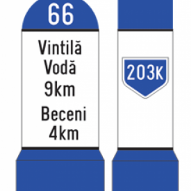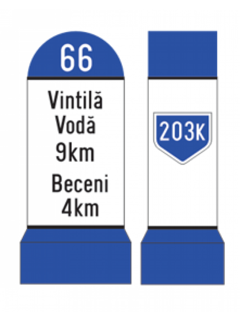 Borna kilometrica plastic drum judetean-folie refl CL I Borna kilometrica plastic drum judetean-folie refl CL I) executata din material plastic colorat în masă materialului în galben. Pe suportul de plastic se aplică folie reflectorizantă, produsă de 3M-SUA, inscripționată conform cererii beneficiarului. Culoarea indicatorului kilometric și clasă de folie reflectorizantă utilizată diferă în funcție de categoria drumului. Pentru drumurile comunale (DC) se utilizează folie reflectorizantă clasă 1. Folia reflectorizantă este aplicată pe trei fețe ale indicatorului kilometric (vizibil pentru conducătorii auto din ambele sensuri de circulație și perpendicular pe axul drumului). Sistemul de prindere al indicatoarelor permite fixarea acestora în beton. Sistemul de fixare al indicatorului kilometric este executat din țeava de oțel cu diametrul de 76mm. Sistemele de fixare sunt solidare cu bornele, permițând plantarea acestora direct în beton. Pentru a se evită rotirea indicatoarelor, la partea inferioară a țevii sunt sudate în ‘’X’’ două platbande. Porțiunea țevii care se încastrează în beton este minim 450mm pentru indicatorul kilometric. În cazul în care indicatoarele kilometrice trebuie montate deasupra solului, peste nivelul parapeților metalici tip lisa,acestea sunt executate cu țeava interioară din oțel zincat (d=76mm) cu porțiunea de sub indicatorul kilometric de minim 1500 mm.