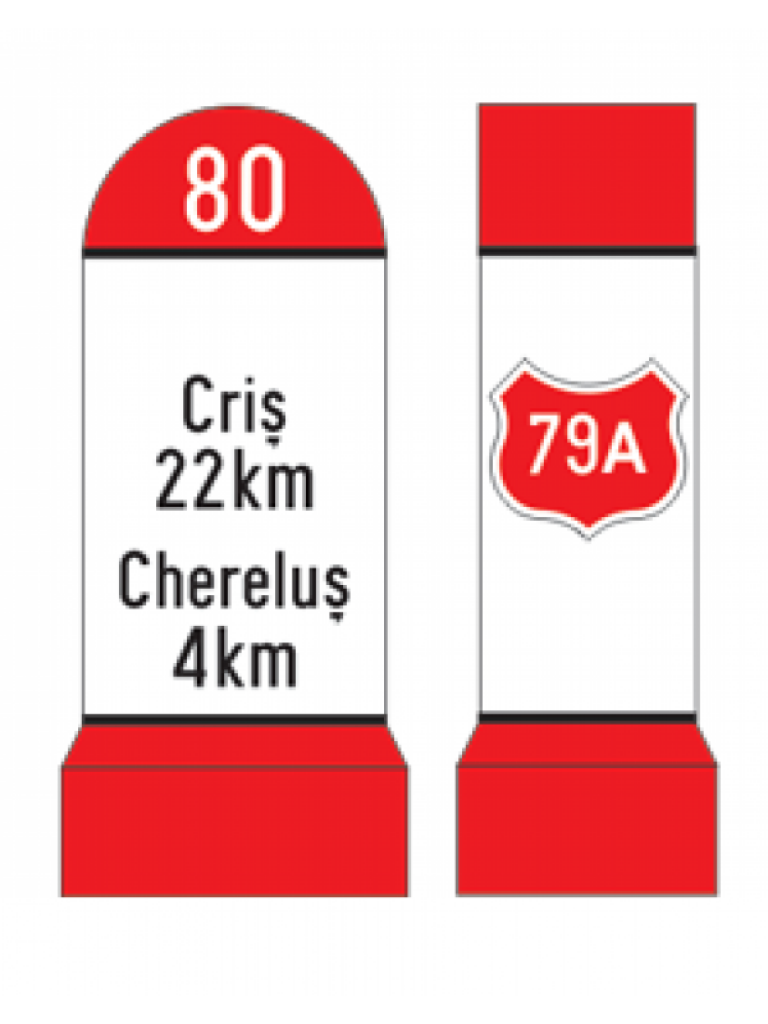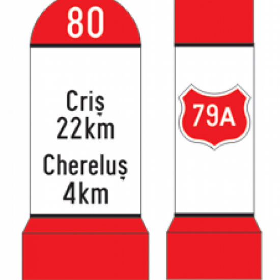 Borna kilometrica plastic drum national - folie refl CL II Borna kilometrica plastic drum national - folie refl CL II executata din material plastic colorat în masă materialului în galben. Pe suportul de plastic se aplică folie reflectorizantă, produsă de 3M-SUA, inscripționată conform cererii beneficiarului. Culoarea indicatorului kilometric și clasă de folie reflectorizantă utilizată diferă în funcție de categoria drumului. Pentru drumurile comunale (DC) se utilizează folie reflectorizantă clasă 1. Folia reflectorizantă este aplicată pe trei fețe ale indicatorului kilometric (vizibil pentru conducătorii auto din ambele sensuri de circulație și perpendicular pe axul drumului). Sistemul de prindere al indicatoarelor permite fixarea acestora în beton. Sistemul de fixare al indicatorului kilometric este executat din țeava de oțel cu diametrul de 76mm. Sistemele de fixare sunt solidare cu bornele, permițând plantarea acestora direct în beton. Pentru a se evită rotirea indicatoarelor, la partea inferioară a țevii sunt sudate în ‘’X’’ două platbande. Porțiunea țevii care se încastrează în beton este minim 450mm pentru indicatorul kilometric. În cazul în care indicatoarele kilometrice trebuie montate deasupra solului, peste nivelul parapeților metalici tip lisa,acestea sunt executate cu țeava interioară din oțel zincat (d=76mm) cu porțiunea de sub indicatorul kilometric de minim 1500 mm.