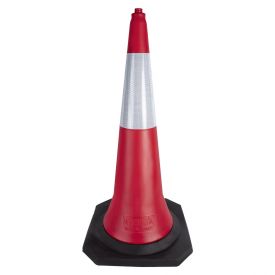 Con pentru trafic, MFK, 1000 mm, 5 Kg, baza de cauciuc, o banda reflectorizanta, PVC, rosu se utilizeaza in amenajarile drumurilor, trotuarelor, zonelor de parcare, zonelor in care intrarea vehiculului este interzisa, ca separator de banda pe drumuri, lucrari de intretinere si reparatii temporare ale drumurilor, santiere etc.