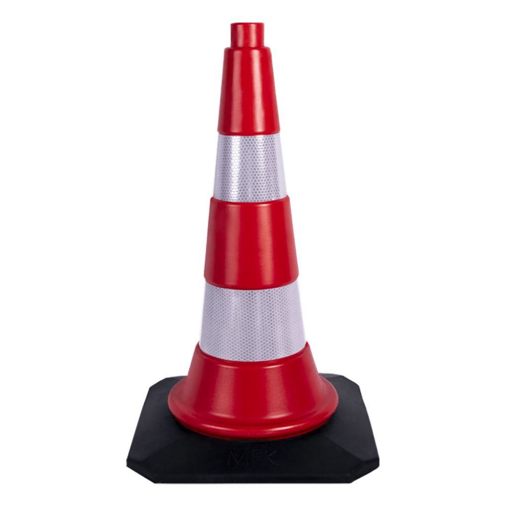 Con pentru trafic, MFK, 500 mm, 1.5 Kg, baza de cauciuc, doua benzi reflectorizante, PVC, rosu se utilizeaza in amenajarile drumurilor, trotuarelor, zonelor de parcare, zonelor in care intrarea vehiculului este interzisa, ca separator de banda pe drumuri, lucrari de intretinere si reparatii temporare ale drumurilor, santiere etc.
