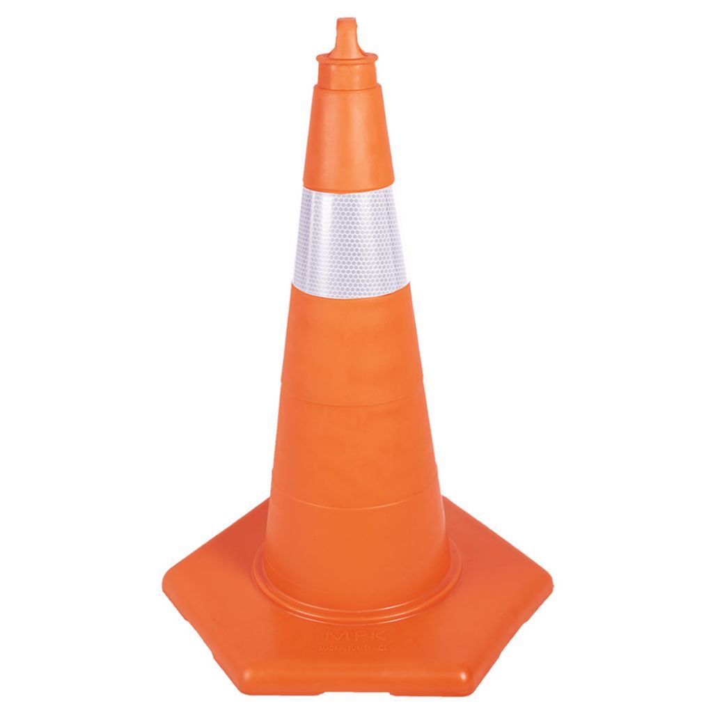 Con pentru trafic, MFK, 750 mm, 3.2 Kg, o banda reflectorizanta, PVC, portocaliu se utilizeaza in amenajarile drumurilor, trotuarelor, zonelor de parcare, zonelor in care intrarea vehiculului este interzisa, ca separator de banda pe drumuri, lucrari de intretinere si reparatii temporare ale drumurilor, santiere etc.