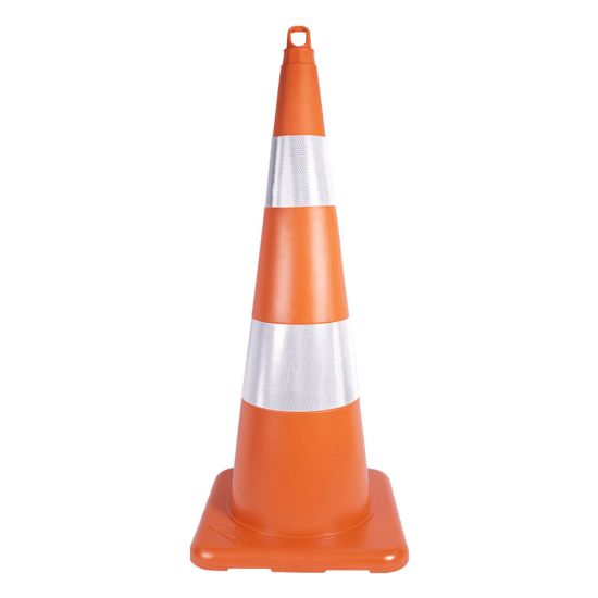 Con pentru trafic, MFK, 900 mm, 3.15 Kg, doua benzi reflectorizante, PVC, portocaliu se utilizeaza in amenajarile drumurilor, trotuarelor, zonelor de parcare, zonelor in care intrarea vehiculului este interzisa, ca separator de banda pe drumuri, lucrari de intretinere si reparatii temporare ale drumurilor, santiere etc.