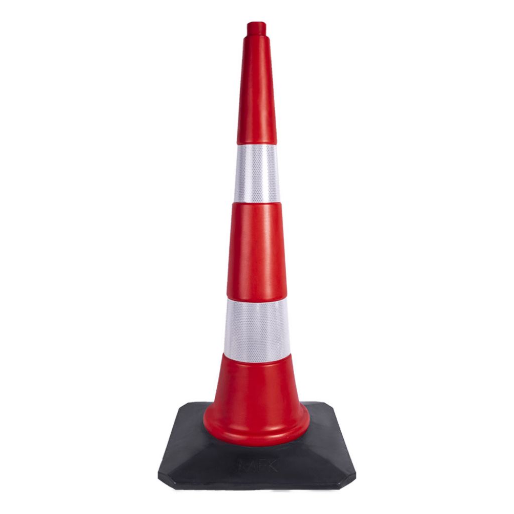 Con pentru trafic, MFK, 900 mm, 3.9 Kg, baza de cauciuc doua benzi reflectorizante, PVC, rosu se utilizeaza in amenajarile drumurilor, trotuarelor, zonelor de parcare, zonelor in care intrarea vehiculului este interzisa, ca separator de banda pe drumuri, lucrari de intretinere si reparatii temporare ale drumurilor, santiere etc.