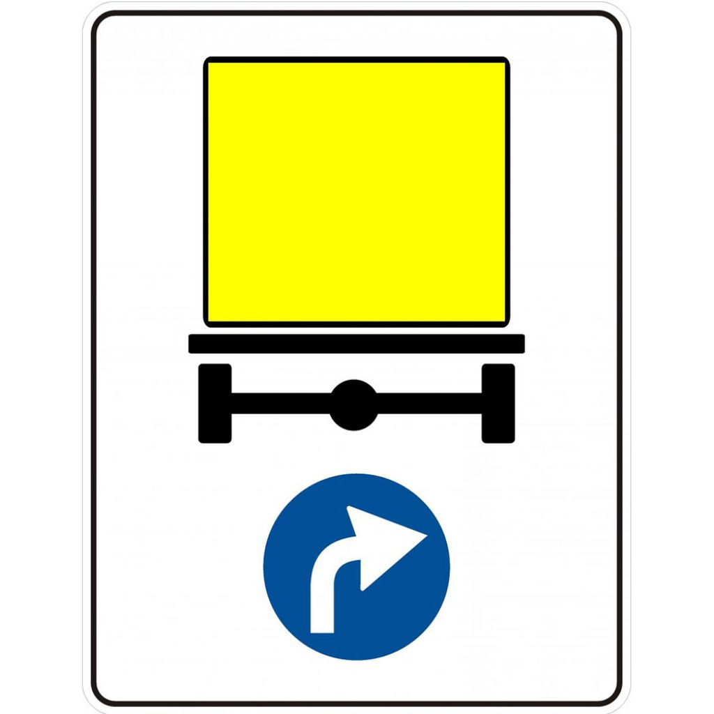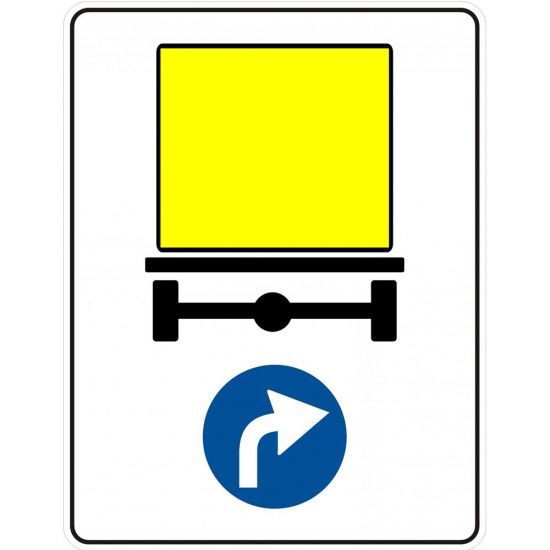 Directia obligatorie pentru vehiculele care transporta marfuri periculoase D17, indicator de obligare. La intalnirea acestor indicatoare vehiculele care transporta marfuri periculoase sunt obligate sa circule pe directia indicata de sageata.
