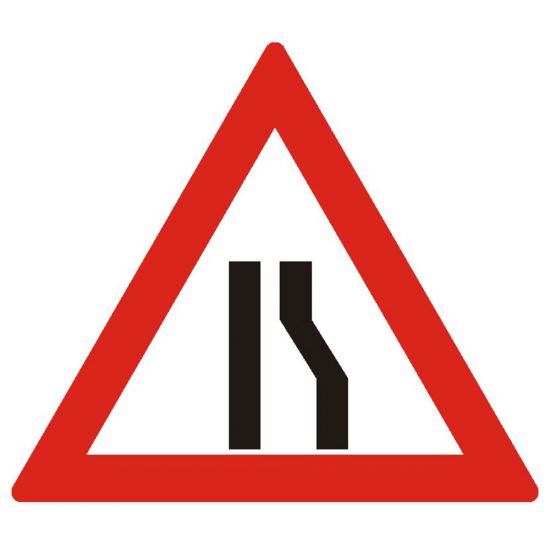 Drum ingustat pe partea dreapta A10, indicator de avertizare se amplasează la 100-200 m de locul în care sectorul de drum începe să se îngusteze pe partea dreaptă cu cel puțin jumătate de metru. La întâlnirea acestui indicator, conducătorul auto este obligat să reducă viteză, iar manevrele de oprire, staționare, mersul înapoi și întoarcerea sunt interzise. Indicatorul poate fi însoțit și de indicatoare pentru reglementarea priorității de drum îngustat.