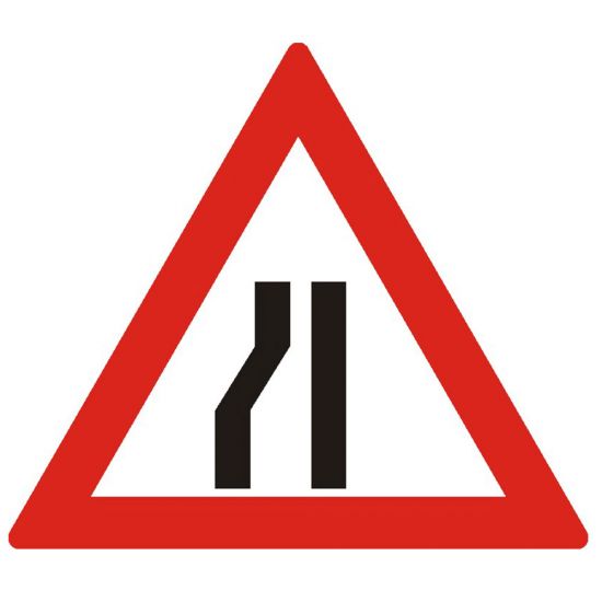 Drum ingustat pe partea stanga A11, indicator de avertizare se amplasează la 100-200 m de locul în care sectorul de drum începe să se îngusteze pe partea stânga cu cel puțin jumătate de metru. La întâlnirea acestui indicator, conducătorul auto este obligat să reducă viteză, iar manevrele de oprire, staționare, mersul înapoi și întoarcerea sunt interzise. Indicatorul poate fi însoțit și de indicatoare pentru reglementarea priorității de drum îngustat.
