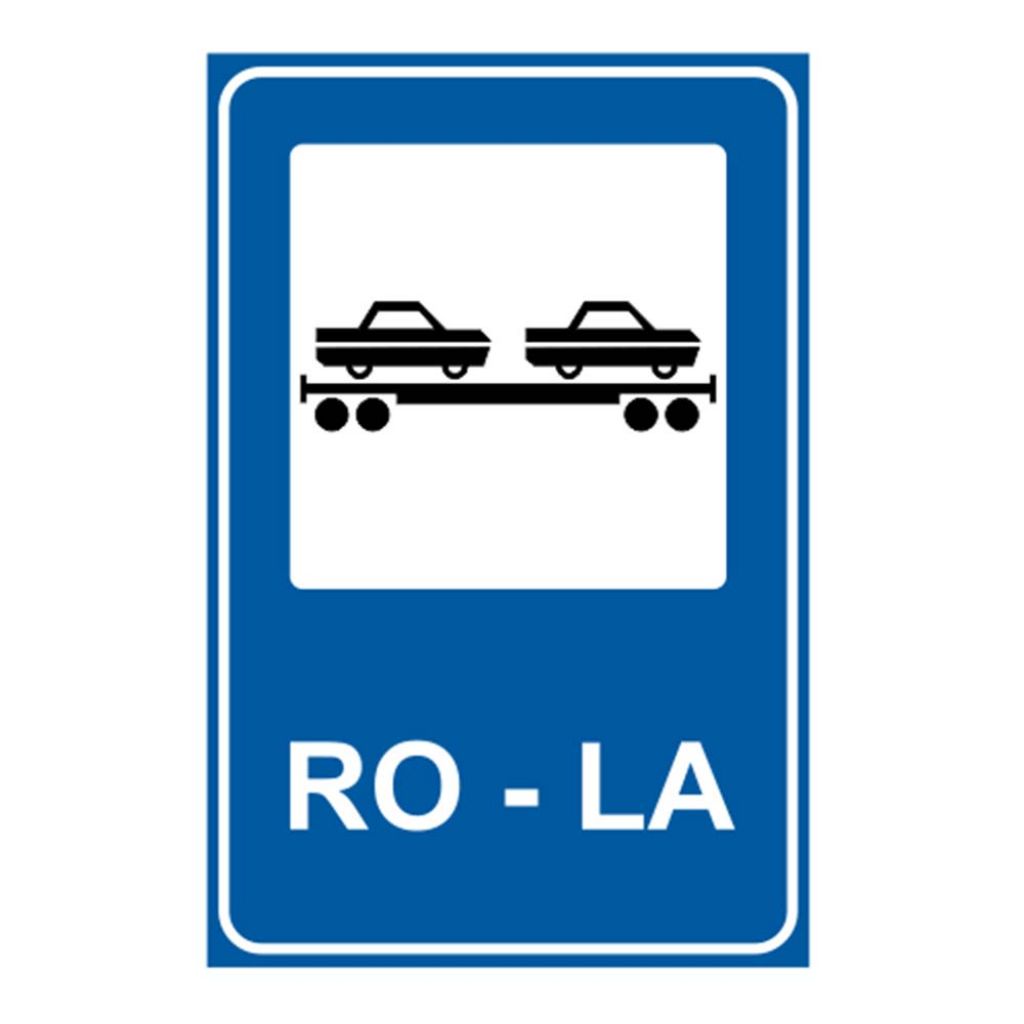 Conducătorul auto va întâlni acest indicator rutier în zona de îmbarcare pe vagoane platformă de cale ferată.