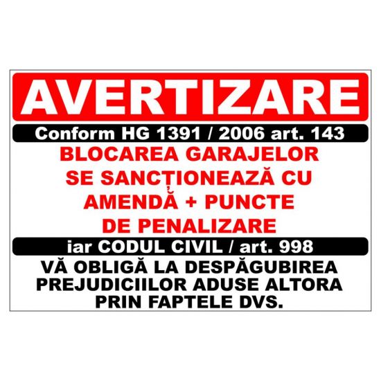 Placuta parcare, avertizare, blocarea garajelor se sanctioneaza cu amenda si puncte de penalizare, Sigtra, 300x400 mm, autocolant vinyl, 0.07 mm