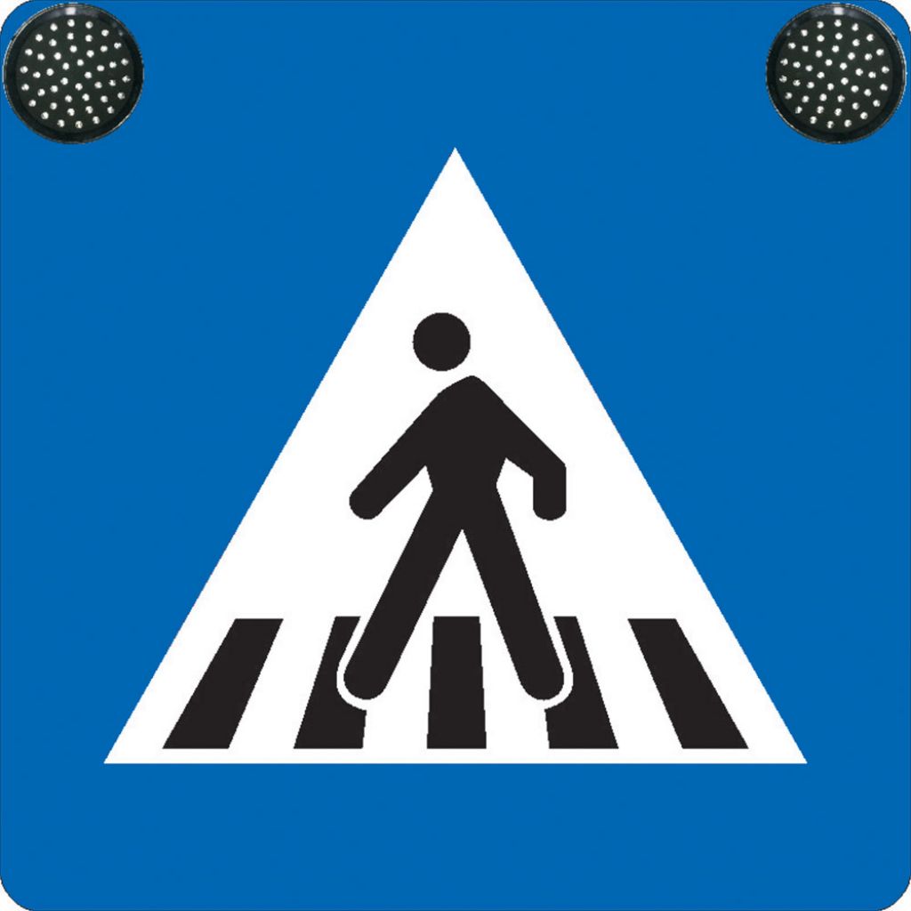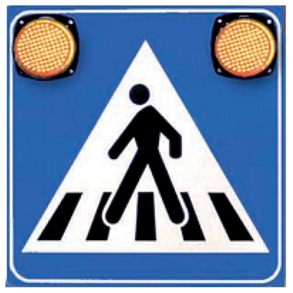 Indicator Trecere pietoni G1 cu Led, alimentare la iluminatul public, fara acumulator este folosit pentru atenționarea de la distantă asupra existenței unei treceri de pietoni. În colțuri sunt prevăzute cu lămpi cu led care sunt vizibile de la mare distantă.