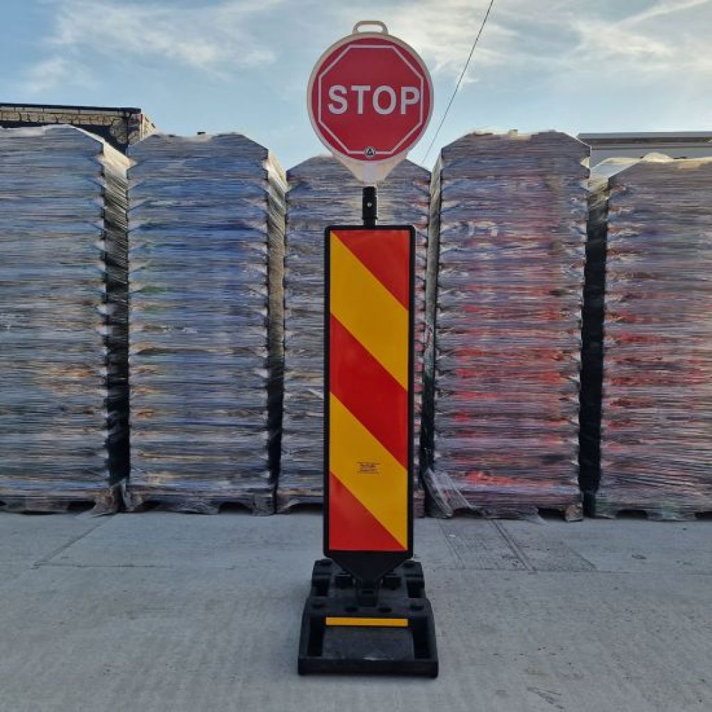 Set baliza semnalizare, folie cl 2, baza 15 kg, cu indicator rotund este un dispozitiv utilizat in ghidarea traficului in zone periculoase ca zonele cu lucrari, santiere sau in orice zona ce necesita semnalizare rutiera.