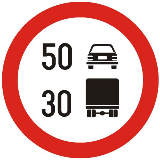 Limitare de viteza diferentiata pe categorii de vehicule C30, indicator de interzicere sau restrictie se amplaseaza pe sectorul de drum unde viteza de circulatie trebuie limitata pe categorii de autovehicule. Zona de actiune incepe din dreptul indicatorului si se termina la intalnirea indicatorului Sfarsitul tuturor restrictiilor. Daca acest indicator este insotit si de indicatorul de localitate, atunci limita de viteza este valabila pentru intreaga localitate.