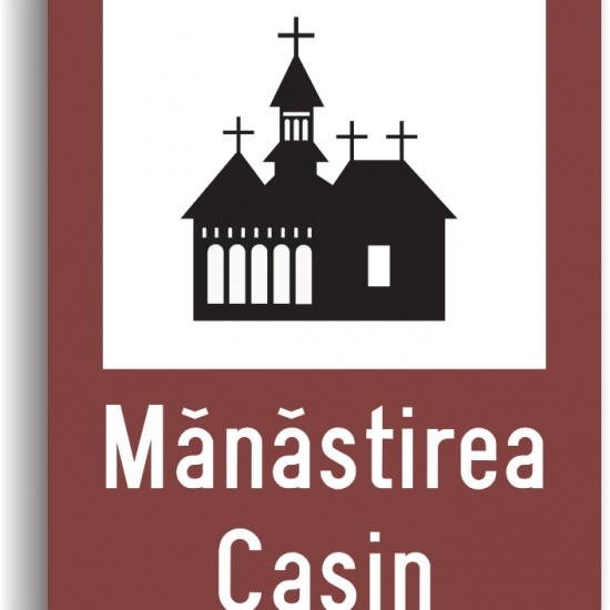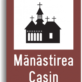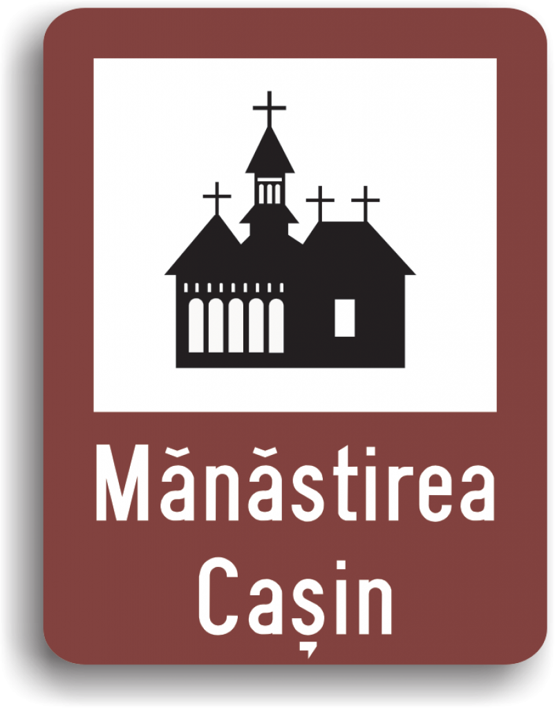 Aceste indicatoare rutiere de informare turistică, se întâlnesc de regulă în apropierea unor mănăstiri. În acest caz, conducătorul auto este informat că se află în apropiere de Mănăstirea Cașin.