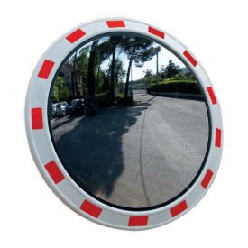Oglinda rutiera rotunda diametru 1000 mm cu bordura rosu-alb este confectionata din materiale plastice tratate pentru a asigura rezistenta mare la impact, intemperii, razele UV si praf.