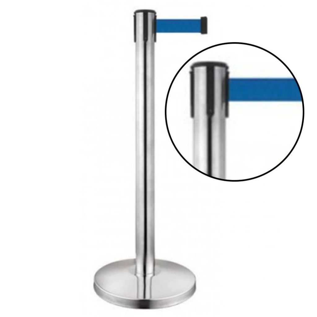 Stalp de ghidare si delimitare, argintiu, cu banda retractabila, albastra, 1.5 metri se folosește la delimitarea zonelor dintr-o anumită începere unde nu este permisă intrarea. La intrarea în restaurante sau hoteluri sau la diverse evenimente sau spectacole.